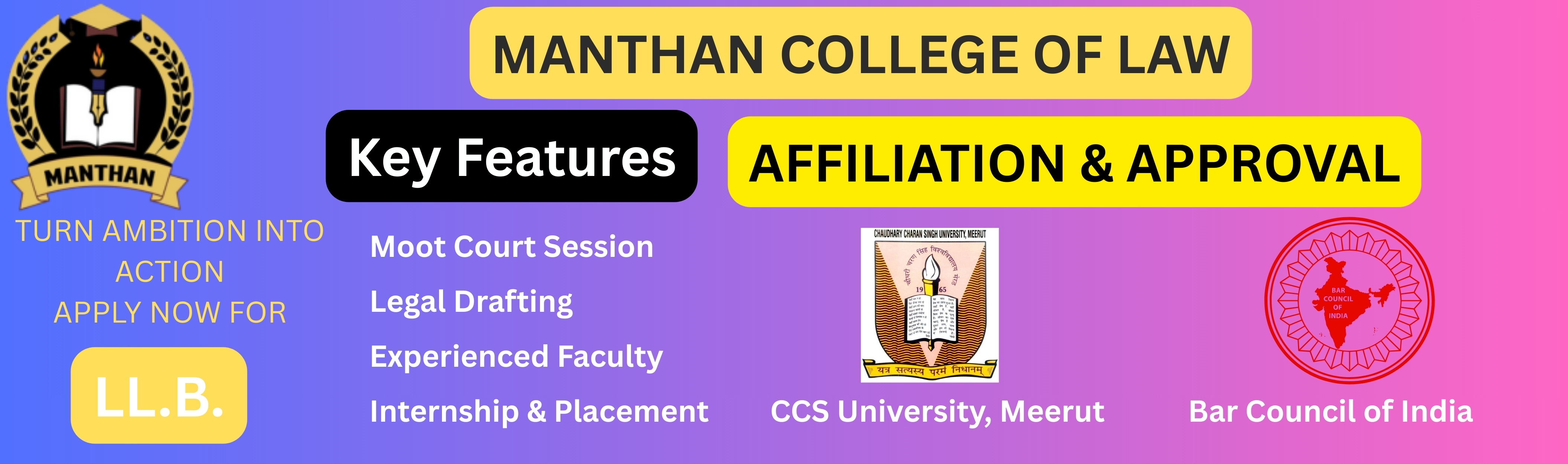 Manthan College of Law, known as one of the best college in Meerut and surrounding. We are known for our discipline and studies. The college offers various Graduation courses in education as well as Science stream. The college has equipped labs and has a very good infrastructure. Students are provided with all facilities like health camps, mediation classes, various communities, and library which has thousands of books. The students who have passed from our college, are holding good posts at respective professional levels.